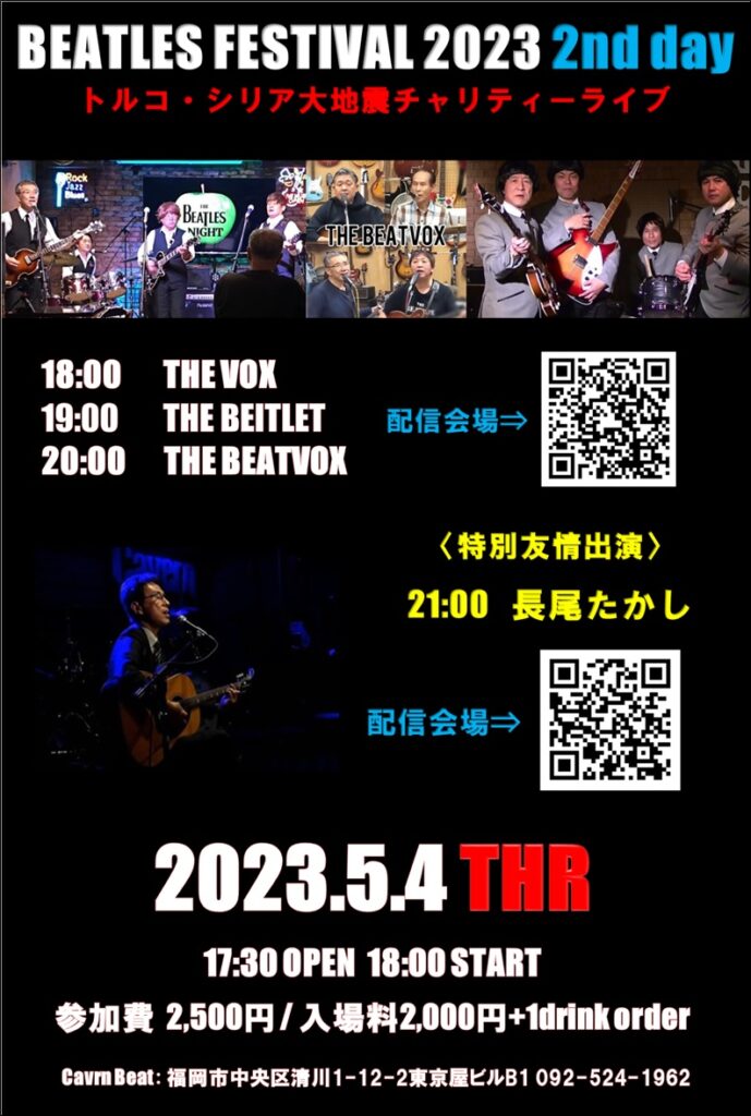 3年ぶりにゴールデンウィークのビートルズ祭りを復活いたします。今回はトルコ・シリア大地震のチャリティーライプとしてキャバーンビートYouTubeチャンネルより生配信いたします。ライブ中の投げ銭につきましてユニセフを通じて寄付いたしますのでご協力何卒よろしくお願い申し上げます。
