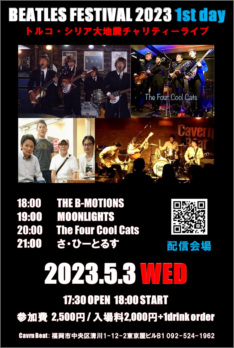 3年ぶりにゴールデンウィークのビートルズ祭りを復活いたします。今回はトルコ・シリア大地震のチャリティーライプとしてキャバーンビートYouTubeチャンネルより生配信いたします。ライブ中の投げ銭につきましてユニセフを通じて寄付いたしますのでご協力何卒よろしくお願い申し上げます。