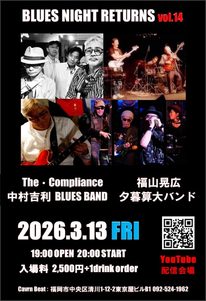 帰ってきた ブルースナイト vol.14 【出演】The Compliance , 福山晃広 , 中村吉利ブルースバンド , 夕暮算大バンド