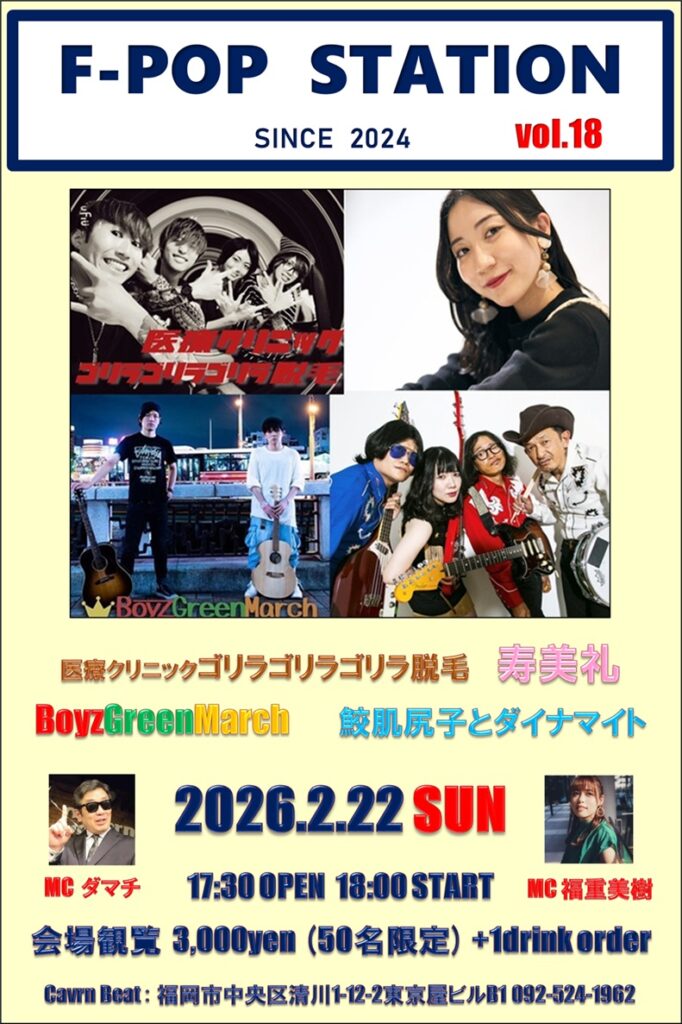 キャバーンビートYouTubeチャンネル登録5000名達成を記念しての第9回目もダマチお奨めの4組を集めて開催いたします。ぜひ一緒に福岡の音楽を盛り上げていきましょう!