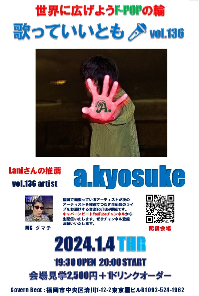 第136回目は歌っていいとも🎤第135回に出演いただいた Laniさんの推薦でa.kyosukeさんのステージをお届けいたしますのでぜひお楽しみください。