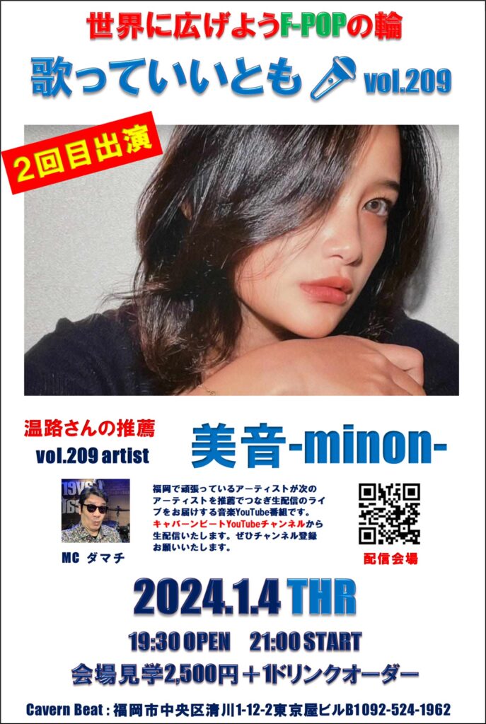 第209回目は歌っていいとも🎤第160回に出演いただいた 温路さんの推薦で美音-minon-さんのステージをお届けいたしますのでぜひお楽しみください。