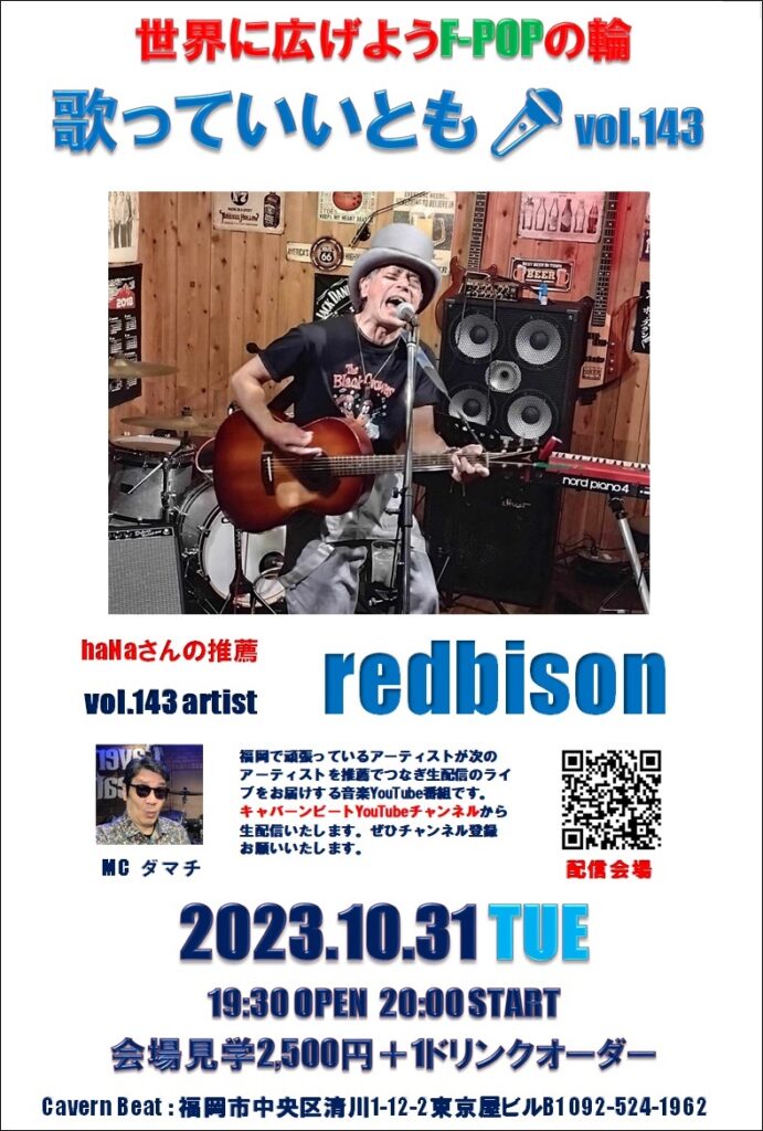 第143回目は歌っていいとも🎤第137回に出演いただいた haNaさんからの推薦でredbisonさんのライブをお楽しみください。