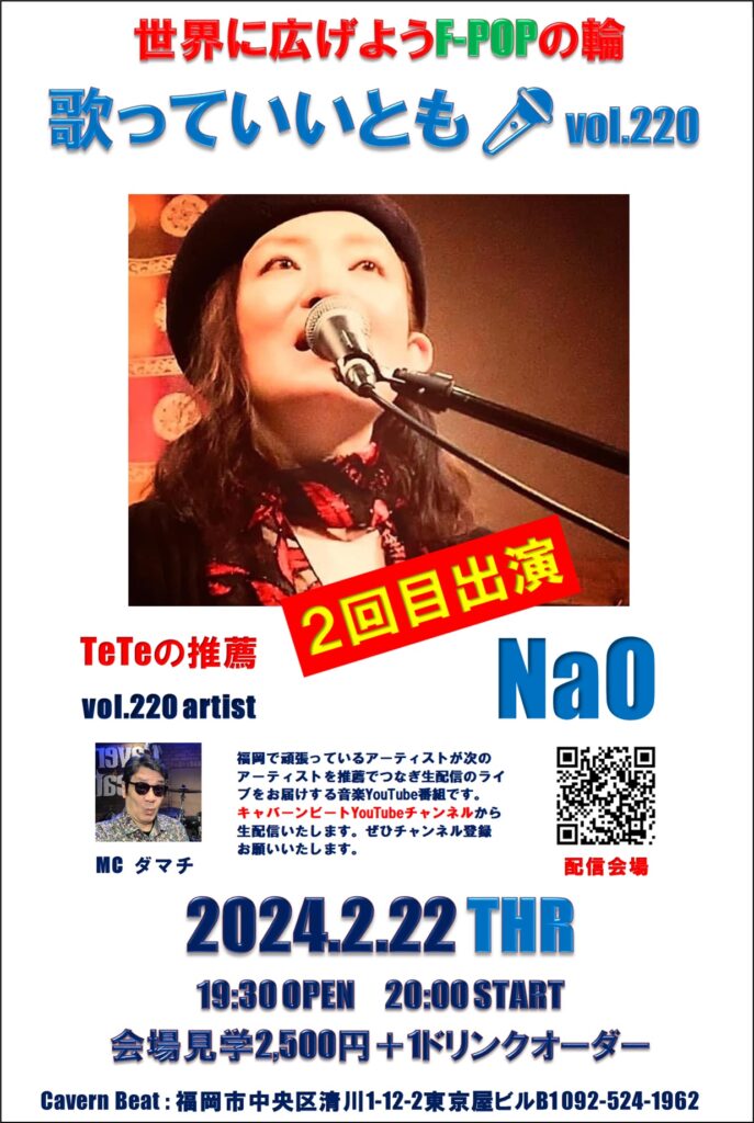 第220回目は歌っていいとも🎤第214回に出演いただいた TeTeからの推薦でNaOさんのステージをお届けいたしますのでぜひお楽しみください。