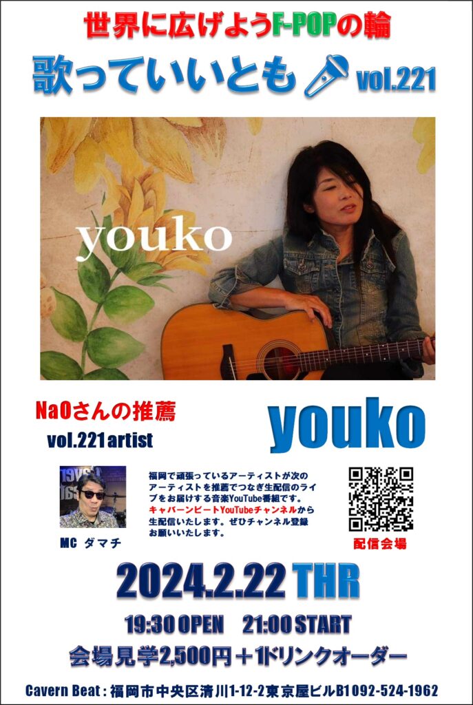 第221回目は歌っていいとも🎤第220回に出演いただいた NaOさんからの推薦でyoukoさんのステージをお届けいたしますのでぜひお楽しみください。