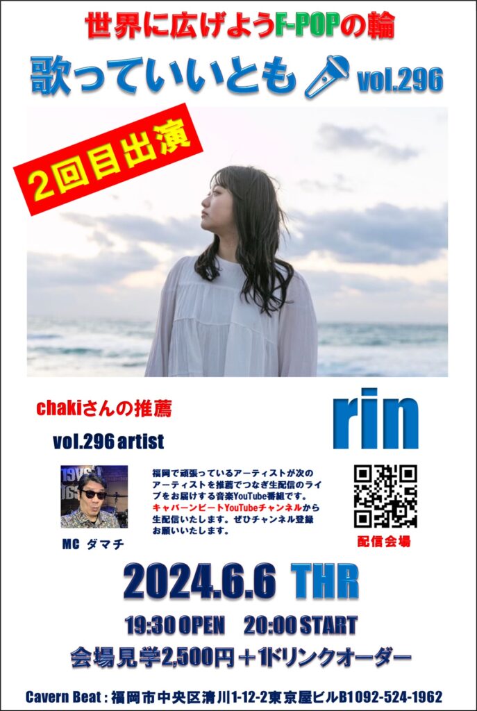 第296回目は歌っていいとも🎤第295回に出演いただいたchakiさんからの推薦でrinさんのステージをお届けいたしますのでぜひお楽しみください。