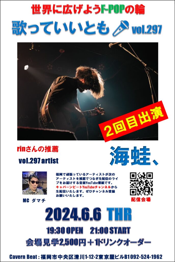 第297回目は歌っていいとも🎤第296回に出演いただいたrinさんからの推薦で海蛙、さんのステージをお届けいたしますのでぜひお楽しみください。