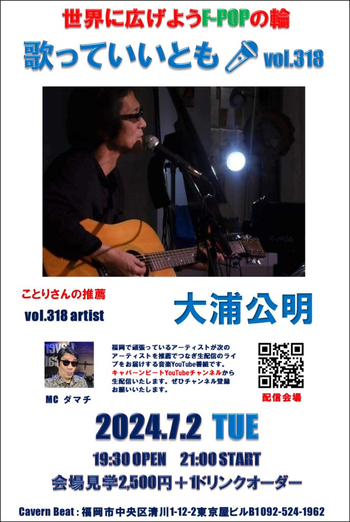第318回目は歌っていいとも🎤第317回に出演いただいたことりさんの推薦で大浦公明さんのステージをお届けいたしますのでぜひお楽しみください。