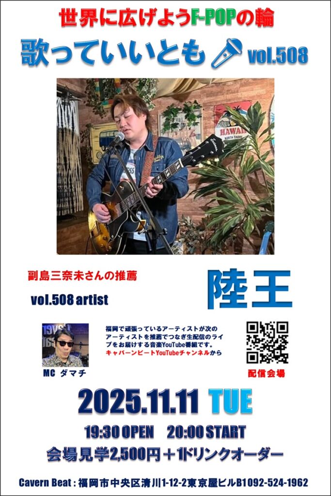 第508回目は歌っていいとも第504回に出演いただいた副島三奈未さんからの推薦で陸王さんのステージをお届けいたしますのでぜひお楽しみください。