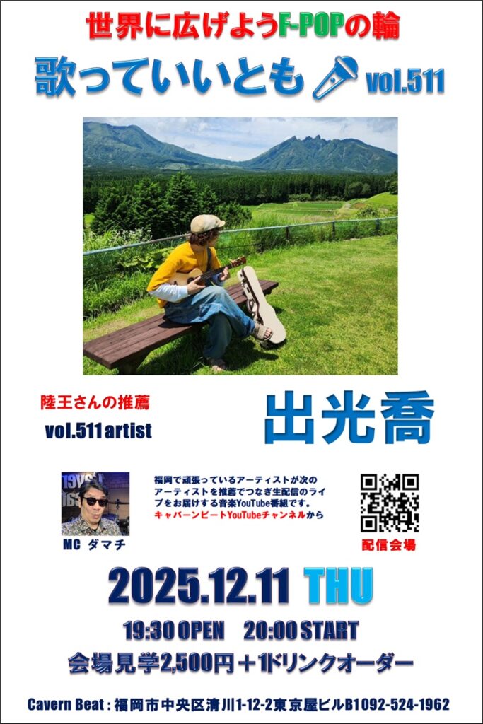 第511回目は歌っていいとも第508回に出演いただいた 陸王さんからの推薦で 出光 喬 (イデミツタカシ)さんのステージをお届けいたしますのでぜひお楽しみください。