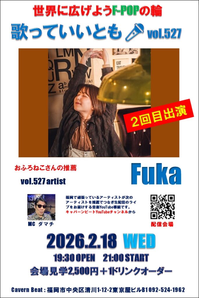 第527回目は歌っていいとも第526回に出演いただいた おふろねこさんからの推薦でFukaさん歌っていいとも🎤2回目のステージをお届けいたしますのでぜひお楽しみください。