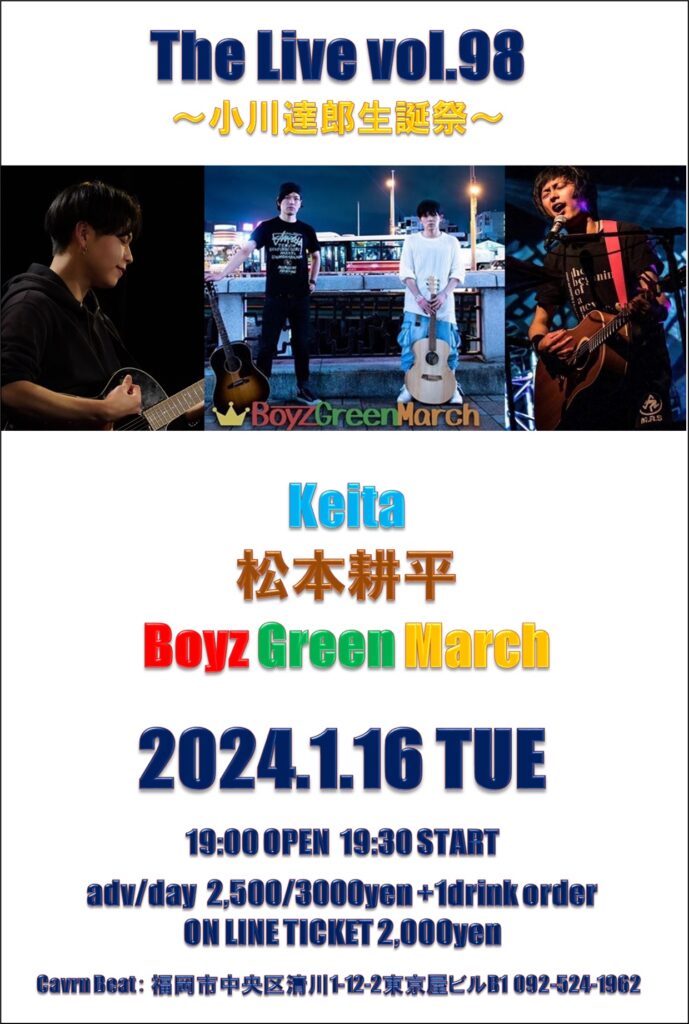 「THE LIVE」はキャバーンビートの若手応援イベントの一つ、「Boyz Green March」がホストとなり主に福岡県内外で活躍中の注目シンガーソングライター、アーティストが出演しています!毎月第3火曜日に開催しています。今回も注目の若手のアーティストが出演しています!